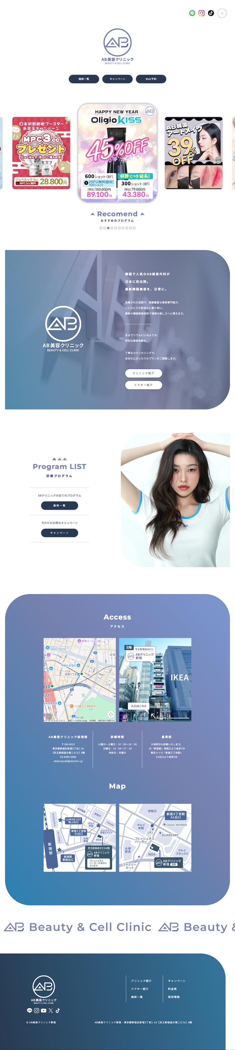 AB美容クリニック新宿様のサイトを制作しました。韓国発の最先端美容医療と丁寧なカウンセリングの特長が伝わるよう、情報整理と導線設計を重視した構成としています。
